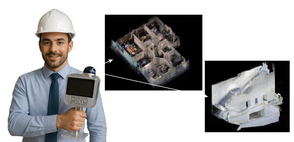DINO introduce la tecnologia SLAM nel rilievo architettonico in una forma sorprendentemente accessibile, grazie a un dispositivo compatto e dal costo contenuto. La sua forza sta nella capacità di acquisire dati spaziali in modo rapido e intuitivo: è sufficiente muoversi all’interno dell’ambiente da rilevare, senza l’impiego di GPS o stazioni totali. Lidar, fotocamera e sensori integrati lavorano in sincronia per generare modelli 3D accurati in tempo reale, anche in contesti complessi o con geometrie irregolari.